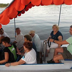 Jedną z większych atrakcji popołudnia był taniec „La bomba" w wykonaniu pracowników „Chaty Wodnika", do którego ochoczo przyłączyli się pozostali uczestnicy pikniku. Po tanecznej gorączce nadszedł czas na kolację – podano aromatyczną kiełbasę z grilla z surówką, bułką i napojem. Wiele osób skorzystało również z rejsu łodzią po jeziorze w przepięknej scenerii zachodzącego słońca. - Zabawa tak się spodobała, że przy pożegnaniu obie grupy zgodnym chórem zadeklarowały chęć uczestnictwa w podobnych imprezach w przyszłym roku – cieszy się Irena Dudek, kierownik DDP w Gostyniu.