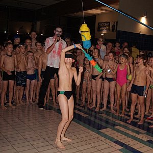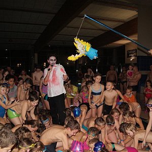 Po wspólnych tańcach nadeszła kolej na zmagania w basenie. Dzieci startowały w zawodach wraz z rodzicami, rodzeństwem, a nawet dziadkami. Były pojedynki wampirów, wyciąganie skarbów z wody, a także wyścigi holowników i batalie grupowe na matach. Tego dnia na uczestników halloweenowej imprezy przebranych za czarownice, duchy, demony, zombie czy wampiry czekało naprawdę wiele atrakcji. Konkursom i zabawom towarzyszyła muzyka, a dzieci bardzo chętnie angażowały się w propozycje animatorów. Dodatkową atrakcją wieczoru była słodka niespodzianka - rozbijanie piniaty z cukierkami. - Pociechy bardzo dobrze bawią się podczas tak niecodziennych atrakcji i miło, że czasem można zaproponować maluchom coś odmiennego – mówi pan Włodek, szukając wzrokiem swoich córek.