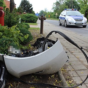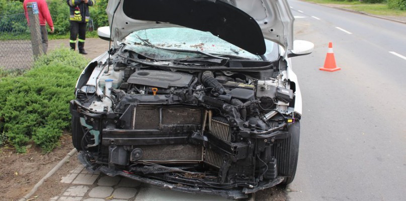 Na prostym odcinku drogi samochód osobowy uderzył w tył naczepy ciągnika rolniczego. Poważnie uszkodzony został przód osobówki. Kierowcom nic się nie stało. Sprawę winy i odszkodowania postanowili załatwić między sobą.