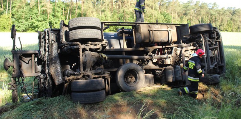 Cysterna wypełniona masą asfaltową wjechała w pole i przewróciła się na bok. Z jej wnętrza wypływa ciekła masa, której neutralizacją zajmują się strażacy. Kierowcę przewieziono dla szpitala. Na miejscu cały czas pracują policjanci, którzy ustalają przyczyny i okoliczności zdarzenia.