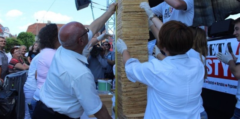 - Trzymaj się! Dacie radę! - krzyczeli pod sceną uczestnicy Gostyńscy Dnia Mleka, dopingując uczestników bijących rekord świata w budowie wafla kajmakowego. I udało się! Przed sceną stanęła wysoka na 1,5 metra wieża kajmakowa, którą pokrojono na kawałki i rozdano wszystkim, którzy mieli ochotę spróbować czegoś słodkiego.