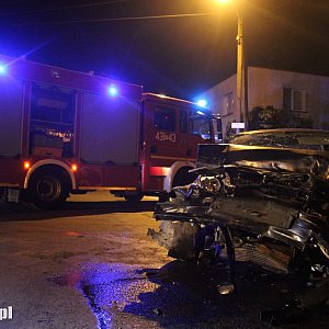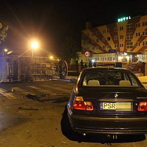 W środku nocy młody kierowca BMW zignorował znak "Stop" i doprowadził do zderzenia z ciężarówką. Uderzenie było na tyle silne, że mercedes przewrócił się na bok, blokując przejazd na całej szerokości jezdni.