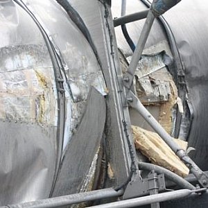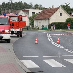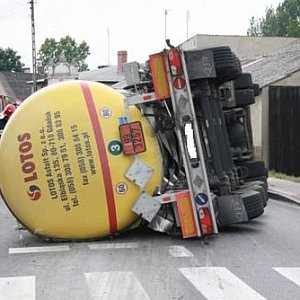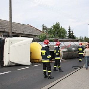Przewrócona ciężarówka, przez około 100m ?ślizgała? się po nawierzchni zahaczając stojacego we wjeździe fiata punto, którego niegroźnie uszkodziła. Z kolei jadący z przeciwka kierowca volkswagena polo, widząc zbliżającą się cysternę zdążył zjechać na pobocze i uniknął bezpośredniego zderzenia.