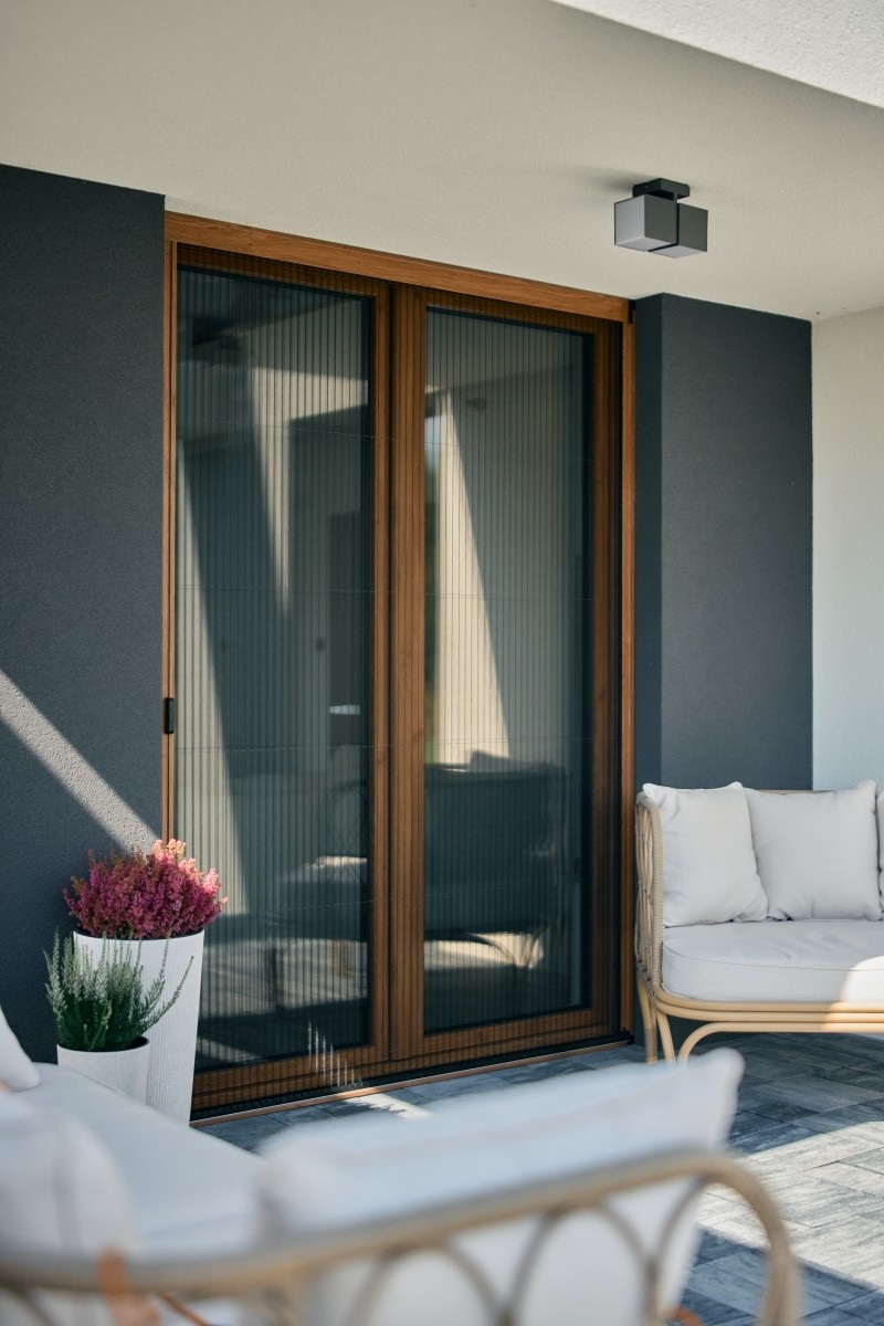 Alternatywą są moskitiery plisowane – kompaktowe i nowoczesne. Zsunięta siatka chowa się w bocznej prowadnicy i zajmuje niewiele miejsca, a niskoprogowa konstrukcja nie stanowi bariery dla dzieci czy osób starszych. Po sezonie zarówno siatkę, jak i skrzydło można szybko zdemontować i bezpiecznie przechować.