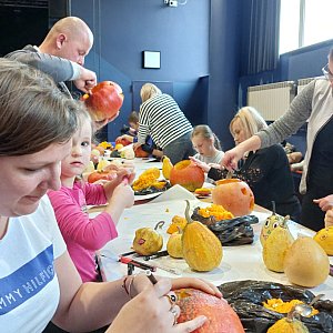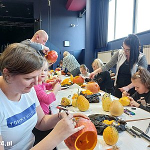Dzieci i ich opiekunowie wykazali się nie lada umiejętnościami przy drążeniu i wycinaniu kształtów. W ruch poszły ostre nożyki, łyżki do lodów a jeden z ojców przygotował nawet ciężki sprzęt w postaci wkrętarki, ale przecież grunt to kreatywność! Dodatkowych kolorów i niezwykłych kształtów ozdobom dodawały też specjalne flamastry. Na zakończenie do dyń włożono świeczki, by zobaczyć efekt warsztatów, a właściciele tych niezwykłych lampionów pozowali z nimi do zdjęć.