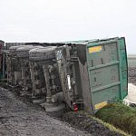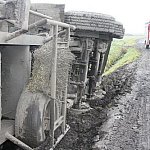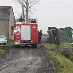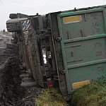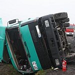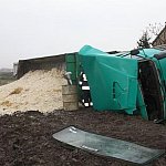 Miękkie i rozmokłe pobocze było prawdopodobnie przyczyną zdarzenia drogowego, do jakiego doszło dziś w Sułkowicach gmina Krobia. Samochód ciężarowy wiozący wysłodki dla jednego z gospodarstw przewrócił się na bok. Ranny został kierowca ciężarówki.