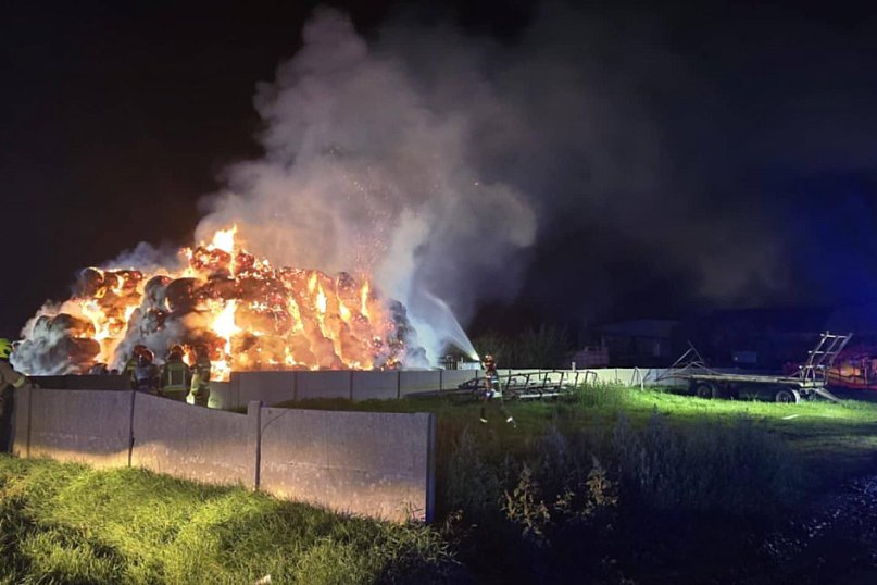 Potężny pożar w Grabianowie pod Krobią. Płoną baloty słomy na jednej z posesji. Na miejscu działają zastępy straży pożarnej