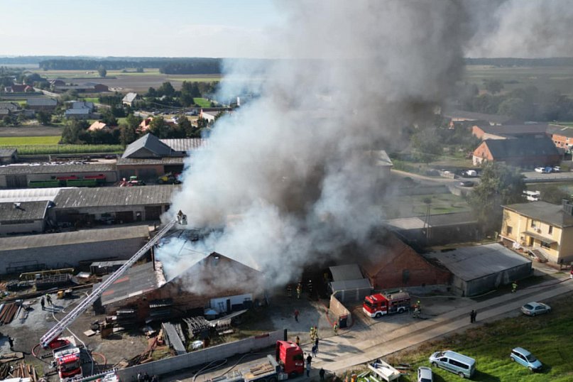 W Czeluścinie od rana trwa duża akcja gaśnicza. Ogień objął budynek o powierzchni około 2 tys. m². Dach praktycznie przestał istnieć, zostały jedynie ściany, a strażacy wciąż prowadzą dogaszanie pogorzeliska.