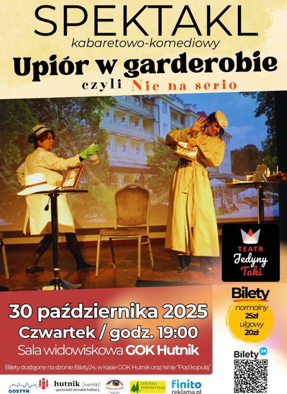 W Gostyniu odbędzie się spektakl kabaretowo-komediowy „Upiór w garderobie, czyli Nic na serio” w wykonaniu Teatru Jedyny Taki. Przedstawienie zaplanowano na 30 października 2025 r. (czwartek) o godz. 19:00 w sali widowiskowej GOK Hutnik. Bilety kosztują 25 zł (normalny) i 20 zł (ulgowy) i są dostępne w kasie GOK Hutnik, w kinie „Pod kopułą” oraz online na Bilety24.