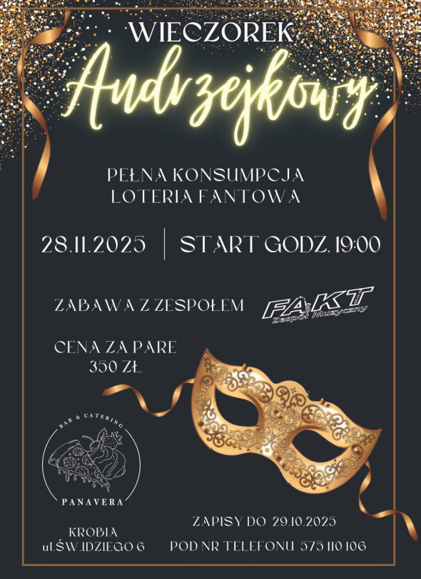 28 listopada 2025 roku o godz. 19:00 w Krobii przy ul. Św. Idziego 6 odbędzie się wyjątkowa zabawa andrzejkowa. W programie pełna konsumpcja, loteria fantowa oraz taneczna noc z zespołem FAKT.