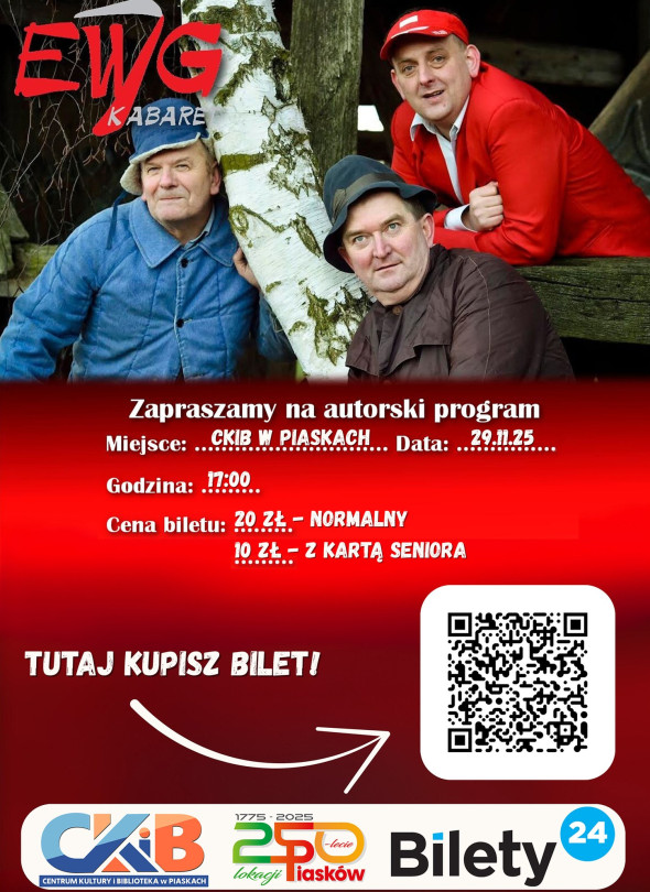 W sobotę 29 listopada o godz. 17:00 w Centrum Kultury i Bibliotece w Piaskach wystąpi kabaret EWG z autorskim programem. Bilety w cenie 20 zł (normalny) oraz 10 zł (z Kartą Seniora) dostępne są online na Bilety24.