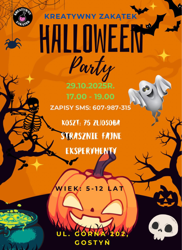 Strasznie fajna zabawa czeka na najmłodszych w Kreatywnym Zakątku! 29 października od godziny 17 do 19 dzieci w wieku od 5 do 12 lat wezmą udział w halloweenowym przyjęciu pełnym eksperymentów, zabawy i niespodzianek. Liczba miejsc ograniczona, więc warto się spieszyć – zapisy przyjmowane są SMS-em pod numerem 607 987 315.