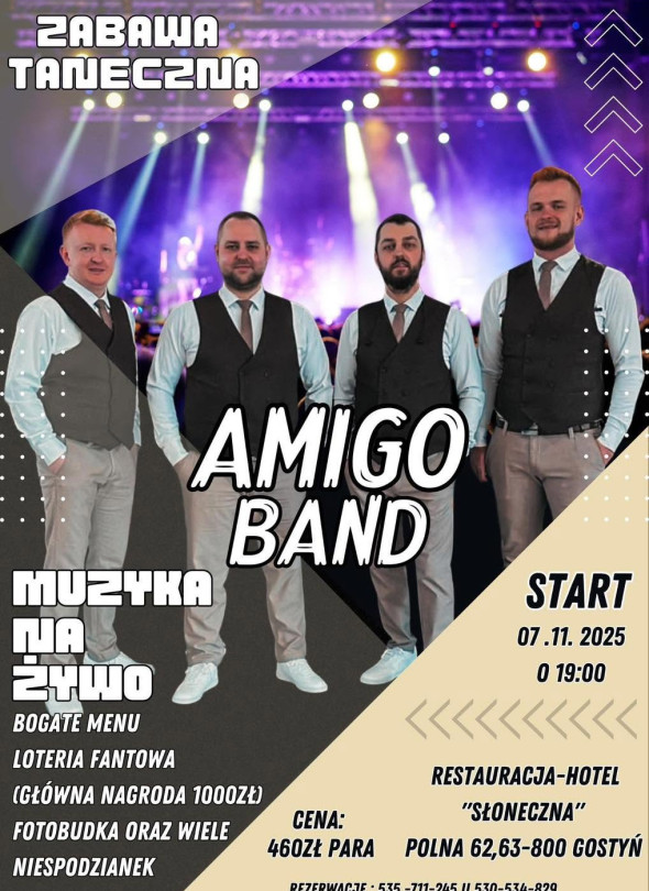 7 listopada o godzinie 19:00 w restauracji-hotel „Słoneczna” w Gostyniu odbędzie się zabawa taneczna z muzyką na żywo w wykonaniu zespołu Amigo Band. Koszt udziału to 460 zł za parę.