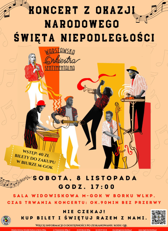 W sobotę, 8 listopada o godz. 17:00 w sali widowiskowej M-GOK w Borku Wlkp. wystąpi Warszawska Orkiestra Sentymentalna. Zespół zabierze publiczność w muzyczną podróż do czasów międzywojnia, pełną nostalgii i radości świętowania.Bilety w cenie 40 zł dostępne są w biurze M-GOK. Koncert potrwa ok. 90 minut bez przerwy.