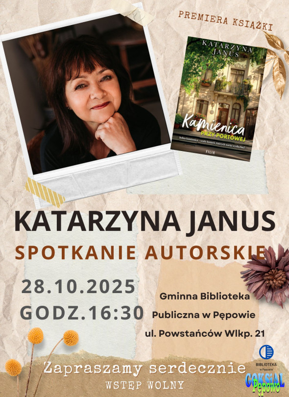 We wtorek, 28 października 2025 roku o godzinie 16.30 w Gminnej Bibliotece Publicznej w Pępowie odbędzie się spotkanie autorskie z Katarzyną Janus, autorką popularnych powieści obyczajowych. Wydarzenie połączone będzie z premierą książki „Kamienica przy Portowej”. Wstęp wolny.