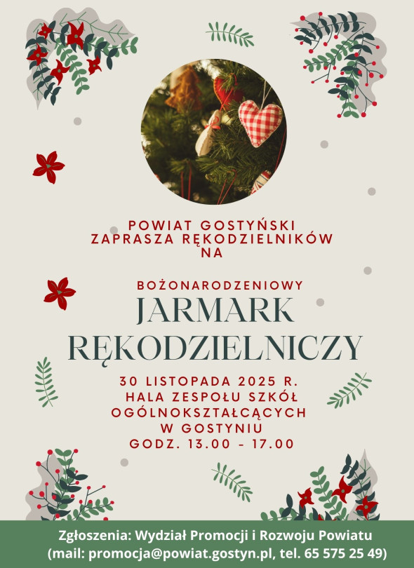 Powiat Gostyński zaprasza twórców i miłośników rękodzieła na Bożonarodzeniowy Jarmark Rękodzielniczy, który odbędzie się w sobotę 30 listopada 2025 roku w hali Zespołu Szkół Ogólnokształcących w Gostyniu. Wydarzenie potrwa od godziny 13:00 do 17:00. To doskonała okazja, by zaprezentować własne wyroby, poznać lokalnych artystów i poczuć świąteczny klimat. Zgłoszenia przyjmuje Wydział Promocji i Rozwoju Powiatu – mailowo pod adresem [email protected] lub telefonicznie pod numerem 65 575 25 49.