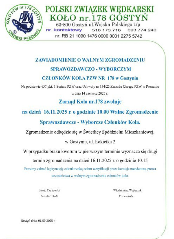 16 listopada 2025 roku o godzinie 10:00 w świetlicy Spółdzielni Mieszkaniowej przy ul. Łokietka 2 w Gostyniu odbędzie się Walne Zgromadzenie Sprawozdawczo-Wyborcze członków Koła PZW nr 178. W razie braku kworum drugi termin wyznaczono na godzinę 10:15. Członkowie proszeni są o zabranie legitymacji w celu weryfikacji.