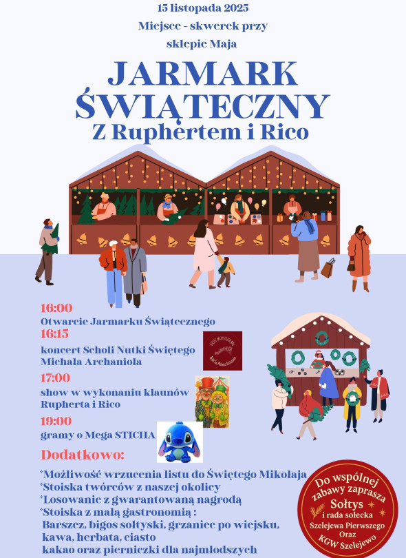 15 listopada 2025 roku na skwerku przy sklepie Maja w Szelejewie odbędzie się jarmark świąteczny z występami, stoiskami i atrakcjami dla całych rodzin. W programie m.in. koncert Scholi Nutki Świętego Michała Archanioła, show klaunów Rupherta i Rico oraz wspólna zabawa z Mega Stichem. Na miejscu stoiska twórców, loteria z nagrodami i świąteczna gastronomia — barszcz, bigos, grzaniec, kawa, herbata, ciasto i pierniczki dla najmłodszych. Organizatorem wydarzenia są sołtys i rada sołecka Szelejewa Pierwszego oraz KGW Szelejewo.