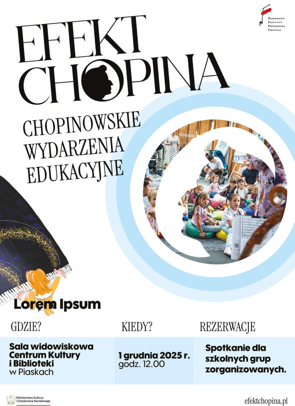 1 grudnia 2025 roku o godzinie 12:00 w sali widowiskowej Centrum Kultury i Biblioteki w Piaskach odbędzie się spotkanie edukacyjne w ramach projektu „Efekt Chopina”, organizowanego przez Narodowy Instytut Fryderyka Chopina. Wydarzenie przeznaczone jest dla szkolnych grup zorganizowanych i ma na celu przybliżenie dzieciom i młodzieży twórczości kompozytora w atrakcyjnej, interaktywnej formie.