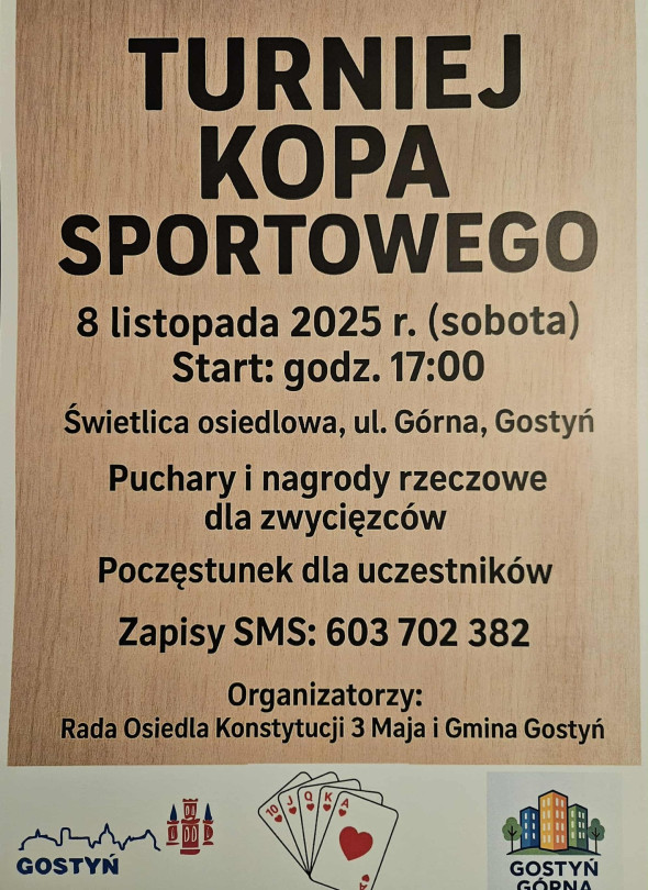 8 listopada 2025 roku (sobota) o godzinie 17:00 w świetlicy osiedlowej przy ul. Górnej w Gostyniu odbędzie się Turniej Kopa Sportowego. Dla najlepszych uczestników przewidziano puchary i nagrody rzeczowe, a na wszystkich graczy czeka poczęstunek. Zapisy przyjmowane są SMS-em pod numerem 603 702 382. Organizatorami wydarzenia są Rada Osiedla Konstytucji 3 Maja i Gmina Gostyń.