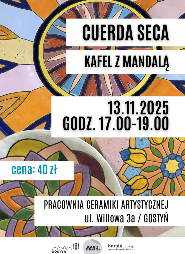 13 listopada 2025 roku w godzinach od 17:00 do 19:00 w Pracowni Ceramiki Artystycznej w Gostyniu przy ul. Willowej 3a odbędą się warsztaty ceramiczne pod hasłem „Cuerda Seca – kafel z mandalą”. Uczestnicy poznają technikę szkliwienia charakterystyczną dla hiszpańskiej ceramiki i wykonają własny, kolorowy kafel z motywem mandali. Koszt udziału w zajęciach wynosi 40 zł.
