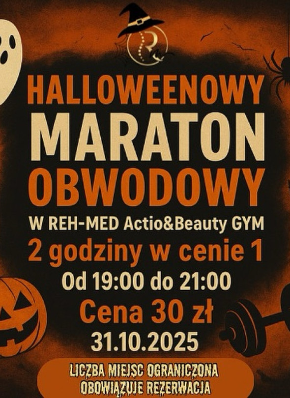 31 października 2025 roku odbędzie się wyjątkowy, halloweenowy maraton treningowy w REH-MED Actio&Beauty GYM. Zajęcia potrwają od godziny 19:00 do 21:00, a uczestnicy skorzystają z dwóch godzin treningu w cenie jednej. Koszt udziału to 30 zł. Liczba miejsc jest ograniczona, obowiązuje wcześniejsza rezerwacja.