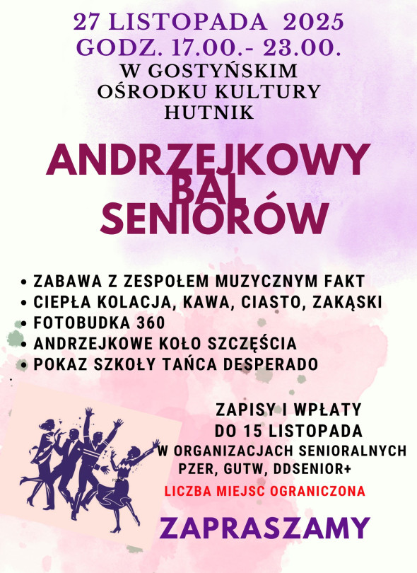 27 listopada 2025 roku w godzinach od 17:00 do 23:00 w Gostyńskim Ośrodku Kultury Hutnik odbędzie się Andrzejkowy Bal Seniorów. W programie m.in. zabawa z zespołem muzycznym Fakt, ciepła kolacja, kawa, ciasto i zakąski, fotobudka 360, Andrzejkowe Koło Szczęścia oraz pokaz Szkoły Tańca Desperado. Zapisy i wpłaty przyjmowane są do 15 listopada w organizacjach senioralnych PZER, GUTW i DDSenior+. Liczba miejsc jest ograniczona.