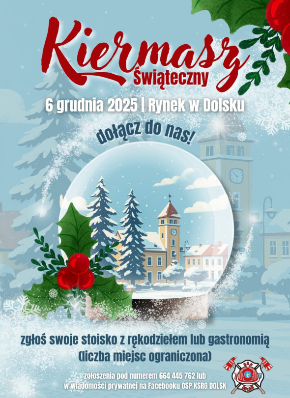 6 grudnia 2025 roku na Rynku w Dolsku odbędzie się kiermasz świąteczny. Organizatorzy zapraszają twórców rękodzieła oraz wystawców z branży gastronomicznej do udziału w wydarzeniu. Liczba miejsc jest ograniczona. Zgłoszenia przyjmowane są pod numerem telefonu 664 445 762 lub w wiadomości prywatnej na Facebooku OSP KSRG Dolsk.