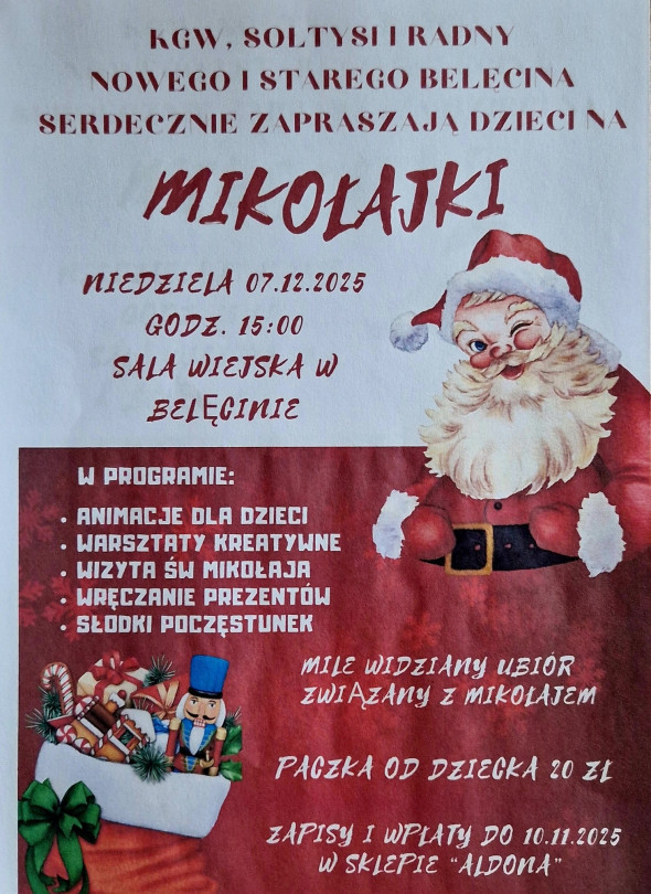 7 grudnia 2025 roku o godzinie 15:00 w sali wiejskiej w Belęcinie odbędą się Mikołajki dla dzieci, organizowane przez KGW, sołtysów i radnych Nowego i Starego Belęcina. W programie przewidziano animacje dla dzieci, warsztaty kreatywne, wizytę Świętego Mikołaja, wręczanie prezentów oraz słodki poczęstunek. Mile widziany strój związany z Mikołajem. Koszt paczki od dziecka wynosi 20 zł. Zapisy i wpłaty przyjmowane są do 10 listopada w sklepie „Aldona”.