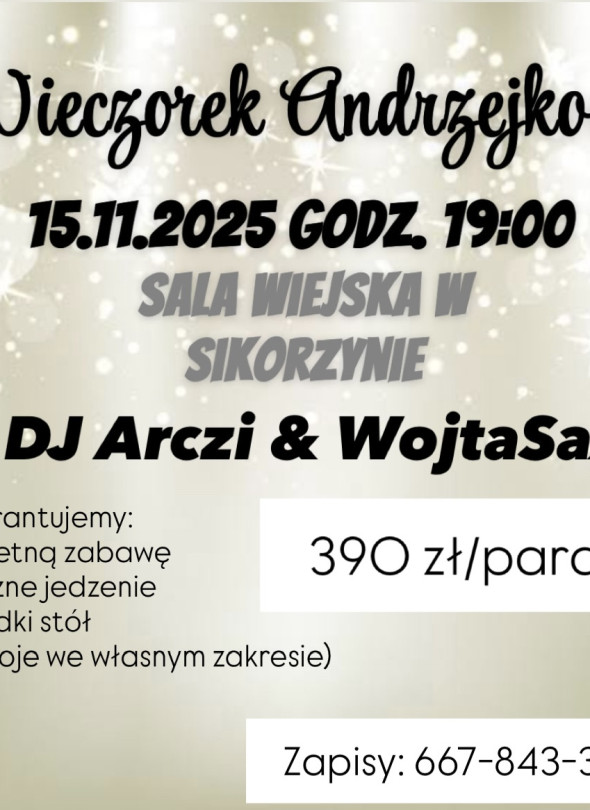 15 listopada 2025 roku o godzinie 19.00 w sali wiejskiej w Sikorzynie odbędzie się Wieczorek Andrzejkowy z muzyką DJ Arczi i WojtaSax. W programie świetna zabawa, pyszne jedzenie i słodki stół. Koszt udziału to 390 zł za parę, napoje we własnym zakresie. Zapisy pod numerem telefonu 667-843-386.