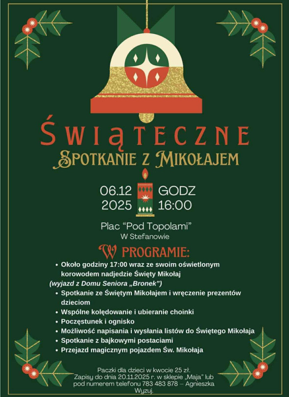 6 grudnia 2025 roku o godz. 16:00 na placu „Pod Topolami” w Stefanowie odbędzie się świąteczne spotkanie z Mikołajem. W programie m.in. przyjazd Świętego Mikołaja z oświetlonym korowodem, wspólne kolędowanie, ubieranie choinki, ognisko i poczęstunek, możliwość pisania listów do Mikołaja oraz spotkanie z bajkowymi postaciami. Paczki dla dzieci w cenie 25 zł, zapisy do 20 listopada w sklepie „Maja” lub pod numerem telefonu 783 483 878.