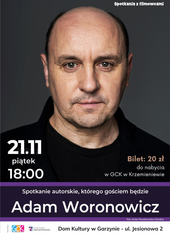 21 listopada (piątek) o godz. 18:00 w Domu Kultury w Garzynie odbędzie się spotkanie autorskie z aktorem Adamem Woronowiczem. Bilety w cenie 20 zł można kupić w Gminnym Centrum Kultury w Krzemieniewie. Organizatorem wydarzenia jest GCK oraz Stowarzyszenie Twórcze Horyzonty.