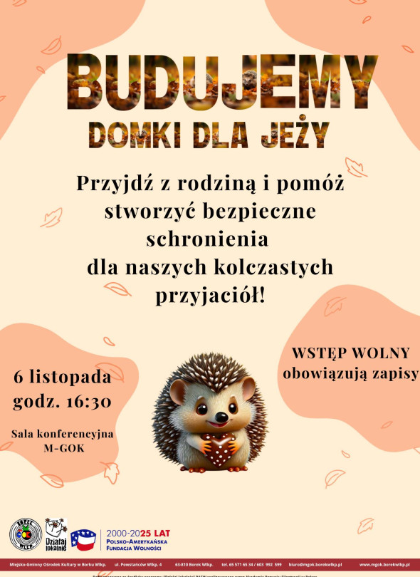 6 listopada o godz. 16:30 w sali konferencyjnej Miejsko-Gminnego Ośrodka Kultury w Borku Wielkopolskim odbędą się rodzinne warsztaty budowania domków dla jeży. Uczestnicy, pod opieką organizatorów, stworzą bezpieczne schronienia dla tych małych, kolczastych zwierząt. Wstęp jest wolny, jednak obowiązują wcześniejsze zapisy.