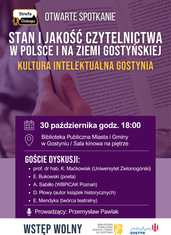 30 października o godz. 18:00 w sali kinowej Biblioteki Publicznej Miasta i Gminy w Gostyniu odbędzie się otwarte spotkanie z cyklu Strefa Dialogu poświęcone kulturze intelektualnej Gostynia. W dyskusji udział wezmą m.in. prof. K. Maćkowiak, poeta E. Bukowski, D. Płowy oraz twórcy i przedstawiciele instytucji kultury. Spotkanie poprowadzi Przemysław Pawlak. Wstęp wolny.