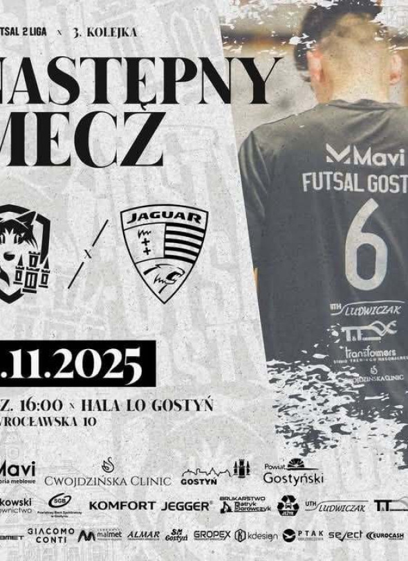 2 listopada 2025 roku o godzinie 16:00 w hali Liceum Ogólnokształcącego w Gostyniu przy ul. Wrocławskiej 10 odbędzie się trzeci mecz 2. Ligi Futsalu. Drużyna Mavi Futsal Gostyń zmierzy się z zespołem Jaguar Gdańsk.