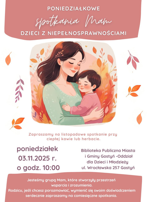 W poniedziałek 3 listopada 2025 roku o godz. 10:00 w Bibliotece Publicznej Miasta i Gminy Gostyń (Oddział dla Dzieci i Młodzieży, ul. Wrocławska 257) odbędzie się kolejne spotkanie Mam dzieci z niepełnosprawnościami. To cykliczne, comiesięczne wydarzenie ma charakter otwarty – to przestrzeń wsparcia, zrozumienia i rozmowy przy ciepłej kawie lub herbacie dla rodziców, którzy chcą podzielić się doświadczeniami i spędzić czas w przyjaznej atmosferze.