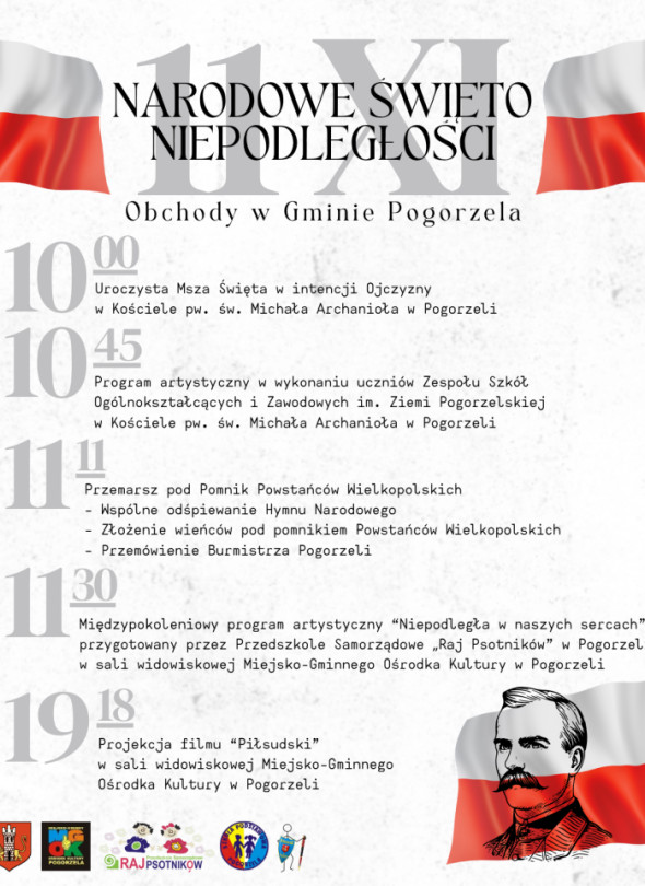 Gmina Pogorzela zaprasza mieszkańców do wspólnego świętowania 11 listopada. Obchody rozpoczną się o godz. 10:00 Mszą Świętą w intencji Ojczyzny w kościele pw. św. Michała Archanioła, po której odbędzie się program artystyczny uczniów miejscowej szkoły. Następnie uczestnicy przemaszerują pod Pomnik Powstańców Wielkopolskich, gdzie złożone zostaną wieńce i odbędzie się przemówienie burmistrza. O 11:30 w sali widowiskowej MGOK zaprezentowany zostanie program „Niepodległa w naszych sercach”, a o 19:18 projekcja filmu „Piłsudski”.