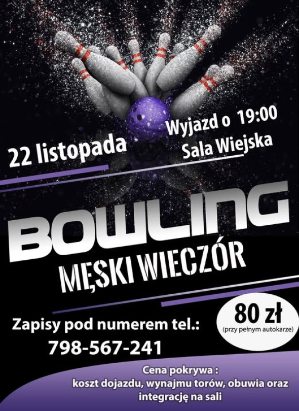 W piątek 22 listopada odbędzie się wyjazdowy wieczór bowlingowy dla panów. Zbiórka uczestników zaplanowana jest o godzinie 19:00 przy Sali Wiejskiej w Lubiniu. Koszt udziału wynosi 80 zł przy pełnym autokarze i obejmuje dojazd, wynajem torów, obuwia oraz wspólną integrację. Zapisy przyjmowane są pod numerem telefonu 798 567 241.