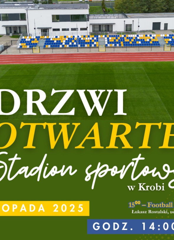 W sobotę 16 listopada 2025 roku w godzinach od 14:00 do 18:00 odbędą się drzwi otwarte nowego stadionu sportowego w Krobi. W programie m.in. pokaz Football Freestyle Show w wykonaniu Łukasza Rostalskiego, uczestnika programu „Mam Talent”. Wydarzenie będzie okazją do zwiedzenia obiektu i wspólnego spotkania mieszkańców.