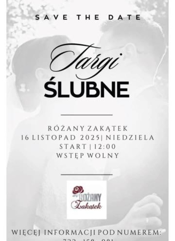 W niedzielę 16 listopada 2025 roku o godzinie 12:00 w Różanym Zakątku odbędą się Targi Ślubne. Wstęp na wydarzenie jest bezpłatny. Organizatorzy zapraszają przyszłe pary młode i wszystkich zainteresowanych tematyką ślubną do zapoznania się z ofertą wystawców. Dodatkowe informacje można uzyskać pod numerem telefonu 722-158-981.