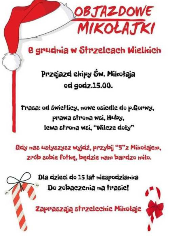 6 grudnia o godz. 15.00 ulicami Strzelec Wielkich przejedzie ekipa Świętego Mikołaja. Trasa rozpocznie się przy świetlicy, obejmie nowe osiedle, prawą i lewą stronę wsi, Huby oraz „Wilcze doły”. Organizatorzy zachęcają mieszkańców, by wyszli na spotkanie, zrobili zdjęcie z Mikołajem i jego ekipą. Dla dzieci do 15 roku życia przewidziano niespodziankę.
