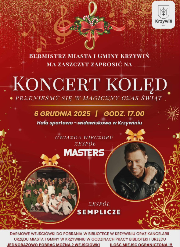 6 grudnia 2025 roku w hali sportowo widowiskowej w Krzywiniu odbędzie się Koncert Kolęd organizowany przez burmistrza miasta i gminy. Wydarzenie rozpocznie się o godzinie 17.00, a gwiazdą wieczoru będzie zespół Masters. Na scenie pojawi się także grupa Semplicze. Darmowe wejściówki można odebrać w bibliotece lub w urzędzie.