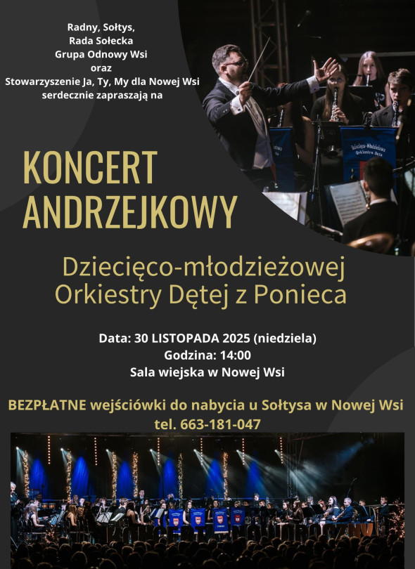 W sali wiejskiej w Nowej Wsi odbędzie się wyjątkowy Koncert Andrzejkowy w wykonaniu Dziecięco-Młodzieżowej Orkiestry Dętej z Ponieca. Wydarzenie zaplanowano na 30 listopada 2025 roku o godzinie 14.00. Organizatorzy – radny, sołtys, Rada Sołecka, Grupa Odnowy Wsi oraz Stowarzyszenie „Ja, Ty, My dla Nowej Wsi” – zapraszają mieszkańców do udziału. Bezpłatne wejściówki można odebrać u sołtysa pod numerem telefonu 663-181-047.