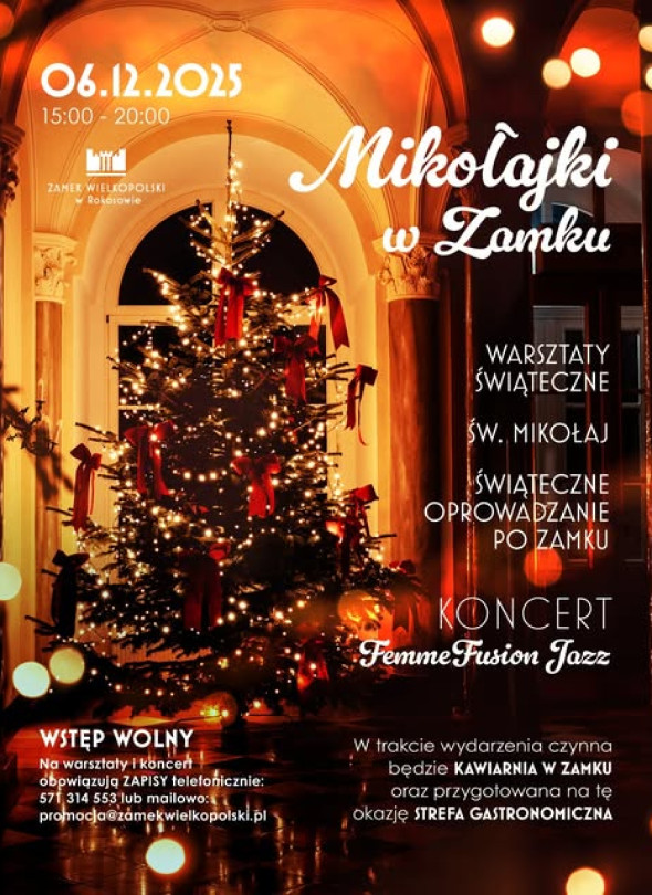 6 grudnia 2025 roku w godzinach od 15.00 do 20.00 w Zamku w Rydzynie odbędą się Mikołajki obejmujące świąteczne warsztaty, spotkanie ze Świętym Mikołajem oraz świąteczne oprowadzanie po zamku. W programie zaplanowano także koncert FemmeFusion Jazz, a podczas wydarzenia czynna będzie zamkowa kawiarnia oraz specjalna strefa gastronomiczna przygotowana na tę okazję.