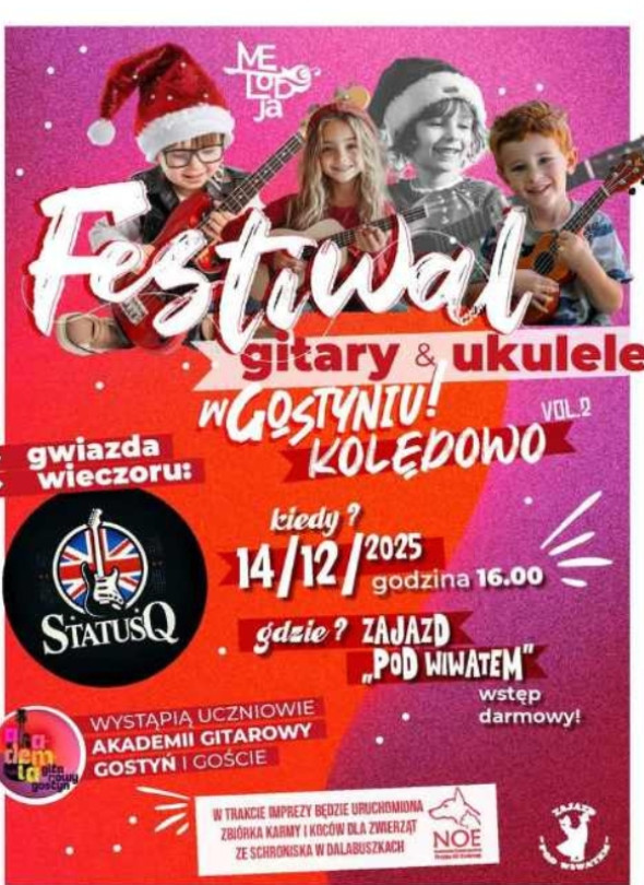 14 grudnia 2025 roku o godzinie 16.00 w Zajeździe Pod Wiwatem odbędzie się świąteczna edycja festiwalu gitary i ukulele z udziałem uczniów Akademii Gitarowej Gostyń oraz zaproszonych gości. Gwiazdą wieczoru będzie zespół Status Q, a udział w wydarzeniu jest bezpłatny. Podczas festiwalu zostanie uruchomiona zbiórka karmy i koców dla zwierząt ze schroniska w Dalabuszkach.