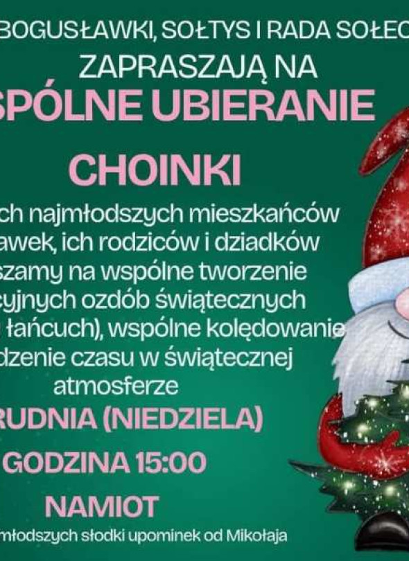 7 grudnia o godzinie 15 w namiocie w Bogusławkach odbędzie się spotkanie dla dzieci, rodziców i dziadków poświęcone wspólnemu tworzeniu świątecznych ozdób, kolędowaniu i spędzeniu czasu w świątecznej atmosferze. Dla najmłodszych przewidziano słodki upominek od Mikołaja.