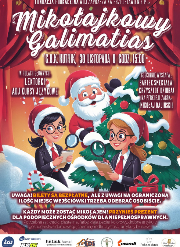 Przedstawienie „Mikołajkowy Galimatias” odbędzie się 30 listopada o godzinie 15.00 w GOK Hutnik w Gostyniu. Wystąpią lektorki ADJ Kursy Językowe, a gościnnie na scenie pojawią się Bartek Smektała i Krzysztof Dziuba, z kolei na perkusji zagra Mikołaj Baliński. Wstęp jest bezpłatny, jednak ze względu na ograniczoną liczbę miejsc wejściówki należy odebrać osobiście. Organizatorzy zachęcają do przyniesienia prezentów dla podopiecznych ośrodków dla osób z niepełnosprawnościami, takich jak kredki, plastelina, farby, papier kolorowy, chemia gospodarcza czy artykuły biurowe.