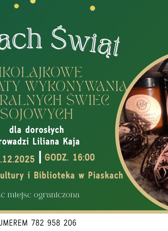 10 grudnia 2025 roku w Centrum Kultury i Bibliotece w Piaskach o godz. 16:00 odbędą się mikołajkowe warsztaty wykonywania naturalnych świec sojowych dla dorosłych, które poprowadzi Liliana Kaja, liczba miejsc jest ograniczona, zapisy przyjmowane są pod numerem telefonu 782 958 206.