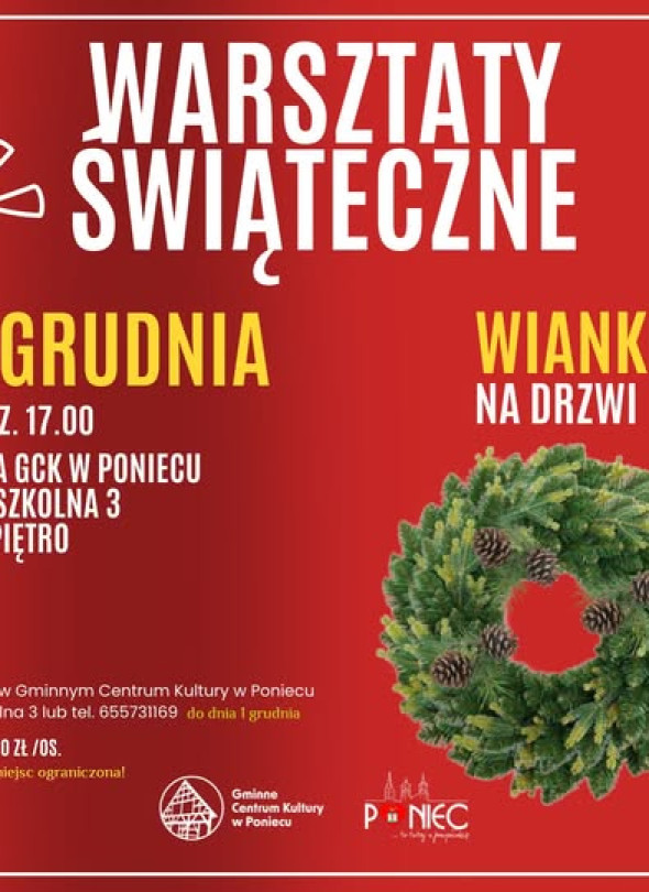 5 grudnia w Poniecu o godzinie 17:00 w sali GCK, ul. Szkolna 3, I piętro, odbędą się warsztaty świąteczne „Wianki na drzwi”. Zapisy prowadzi Gminne Centrum Kultury w Poniecu, ul. Szkolna 3, można też zgłaszać się telefonicznie pod numerem 65 573 16 69 do 1 grudnia, koszt udziału wynosi 70 zł od osoby, liczba miejsc jest ograniczona.