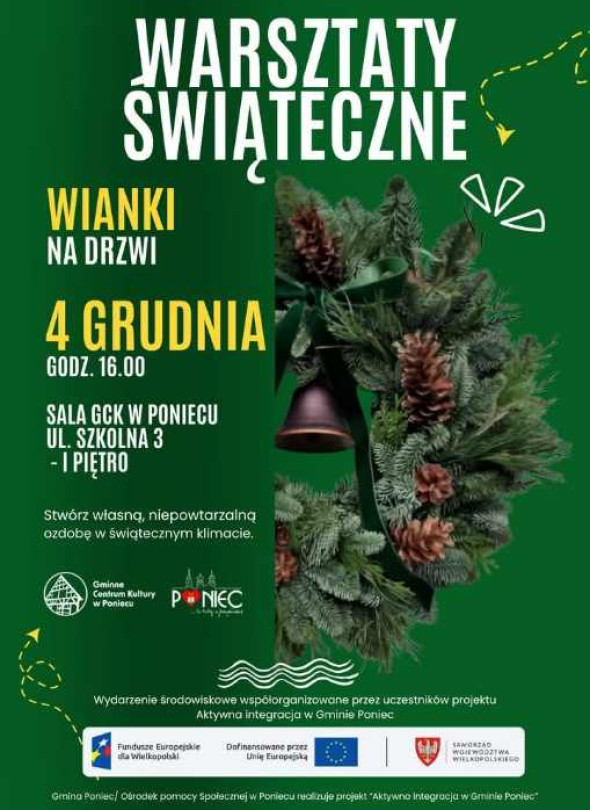 4 grudnia w Poniecu odbędą się warsztaty „Wianki na drzwi”, początek o godz. 16.00 w sali GCK w Poniecu przy ul. Szkolnej 3 na I piętrze. Uczestnicy będą mogli stworzyć własną, niepowtarzalną ozdobę w świątecznym klimacie, wydarzenie organizowane jest w ramach projektu „Aktywna integracja w Gminie Poniec”.